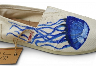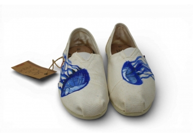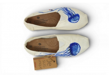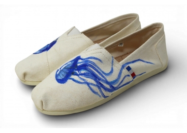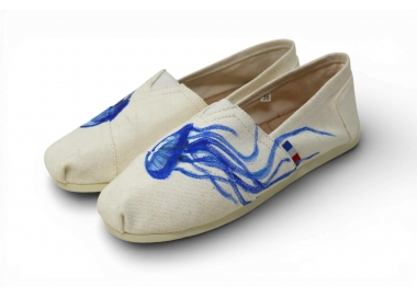 Espadrille peinte à la main motifs méduse bleue — collection capsule exclusive. Pièce unique, fabriquée dans notre atelier à Marseille. Peinture acrylique artisanale sur tige toile blanche. Disponible du 36 au 45, homme et femme. Pré-commande ouverte jusqu'au 30 mars. 89€. Chaque paire est unique — vous ne trouverez jamais deux paires identiques au monde.